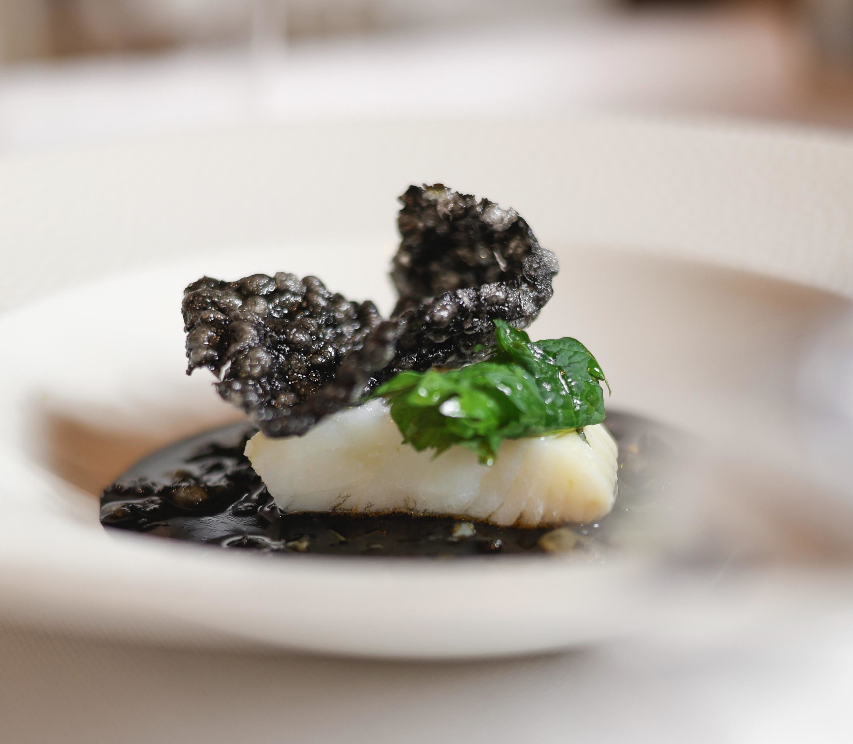 Filetto di baccalà in olio cottura su guazzetto delle sue trippe al nero di seppia